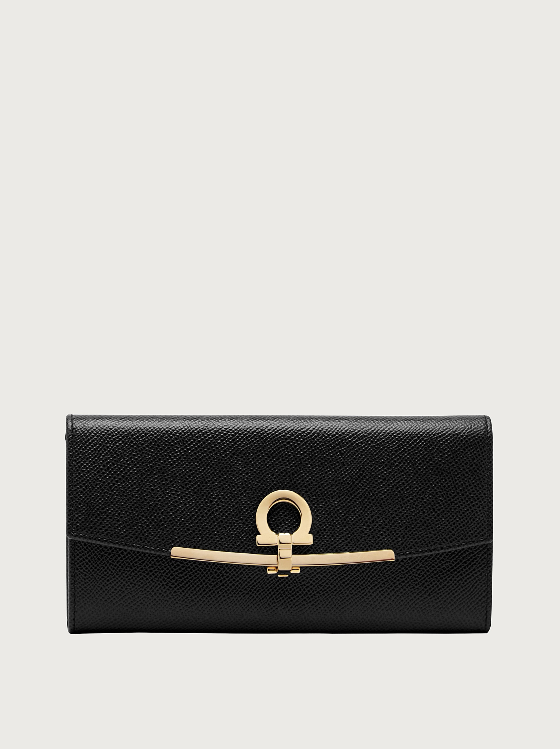 Clip wallet featuring interior pockets, ID case and credit card slots. Enriched by the gold metal Gancini clip closure and bar detail, this accessory is a must have for a woman seeking for uniqueness and elegance. - height 3.9 IN length 7.4 IN - Composition: hammered calf leather - 10 card slots, 2 compartments, 1 coin zip pocket, 3 pockets, 1 external card slot - Made in ITALY - Product code: 22D150 683312