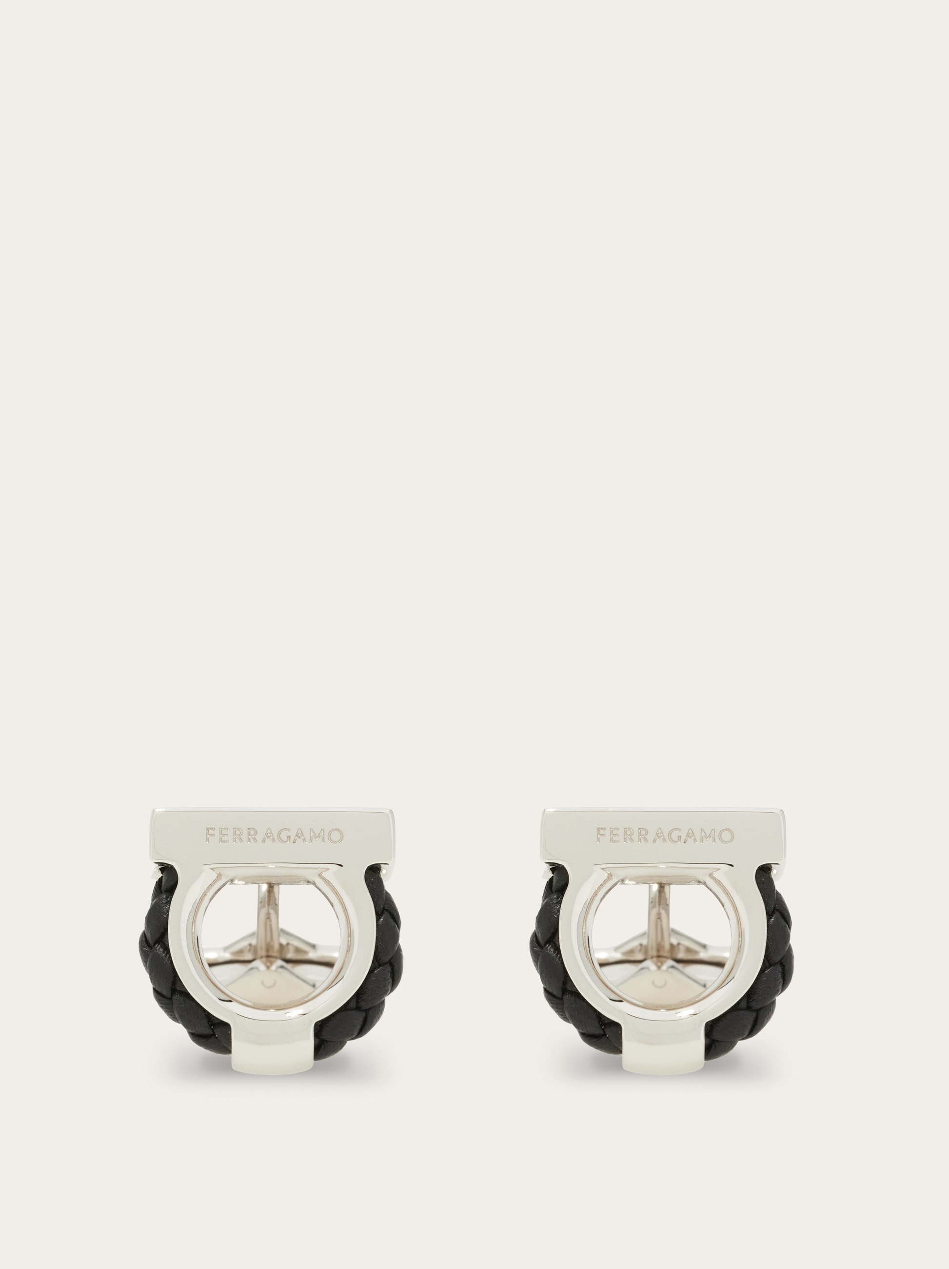 Sporty look cufflinks with a shiny palladium Gancini motif. A tresse leather detail finalizes this casual chic look. Length 22 mm, width 18 mm. - Composition: brass and calfskin - Made in ITALY - Product code: 770142 712427