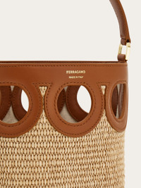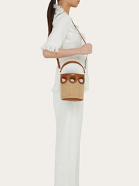 A beautifully woven design and intricate Gancini inlay bring a refined edge to this new mini bucket bag. Celebrating Ferragamo’s heritage in material craftsmanship, it’s a standout accessory for the warmer months, brought to life in vibrant seasonal hues. - height 6.6 IN length 7.0 IN width 4.7 IN - Composition: raffia e calfskin - Handle drop: 5.1 in/13 cm - Extra Small - Made in ITALY - Product code: 220952 783842
