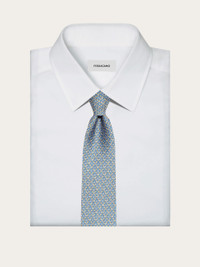 Modern interpretation of the iconic Gancini tie. The pure silk provides a luminous background to the elegant timeless pattern: the Ferragamo Gancini, linked to form a line of chains. A must have for every gentleman. - Composition: 100% silk - Made in ITALY - Product code: 358771 722510