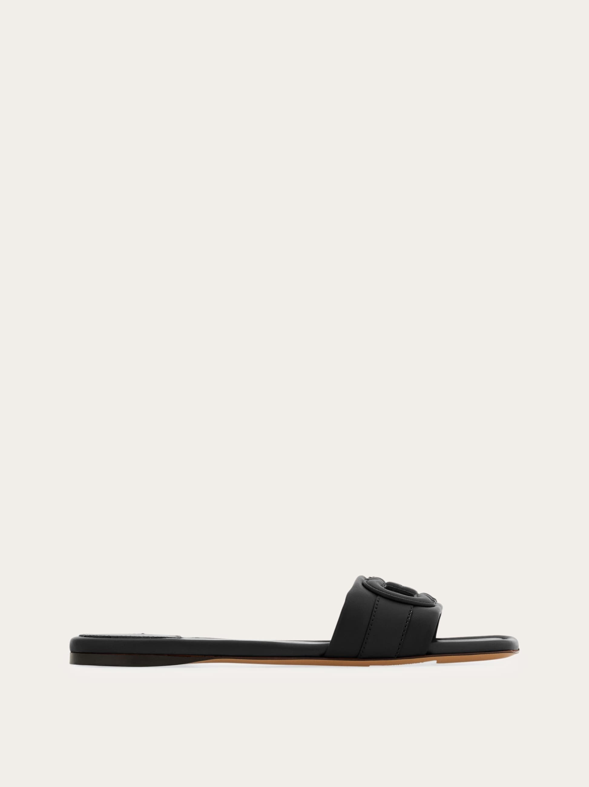 Keep it chic when the temperatures rise: the flat mule by Ferragamo. This easy slide in soft calfskin leather has a padded strap across the toe featuring a raised Gancio with 3D effect double stitching. The soft padding at the insole adds extra comfort, while the golden lettering at the heel is a simple reminder of her high end status. - Composition: calfskin - Made in ITALY - Product code: 01J407 779890