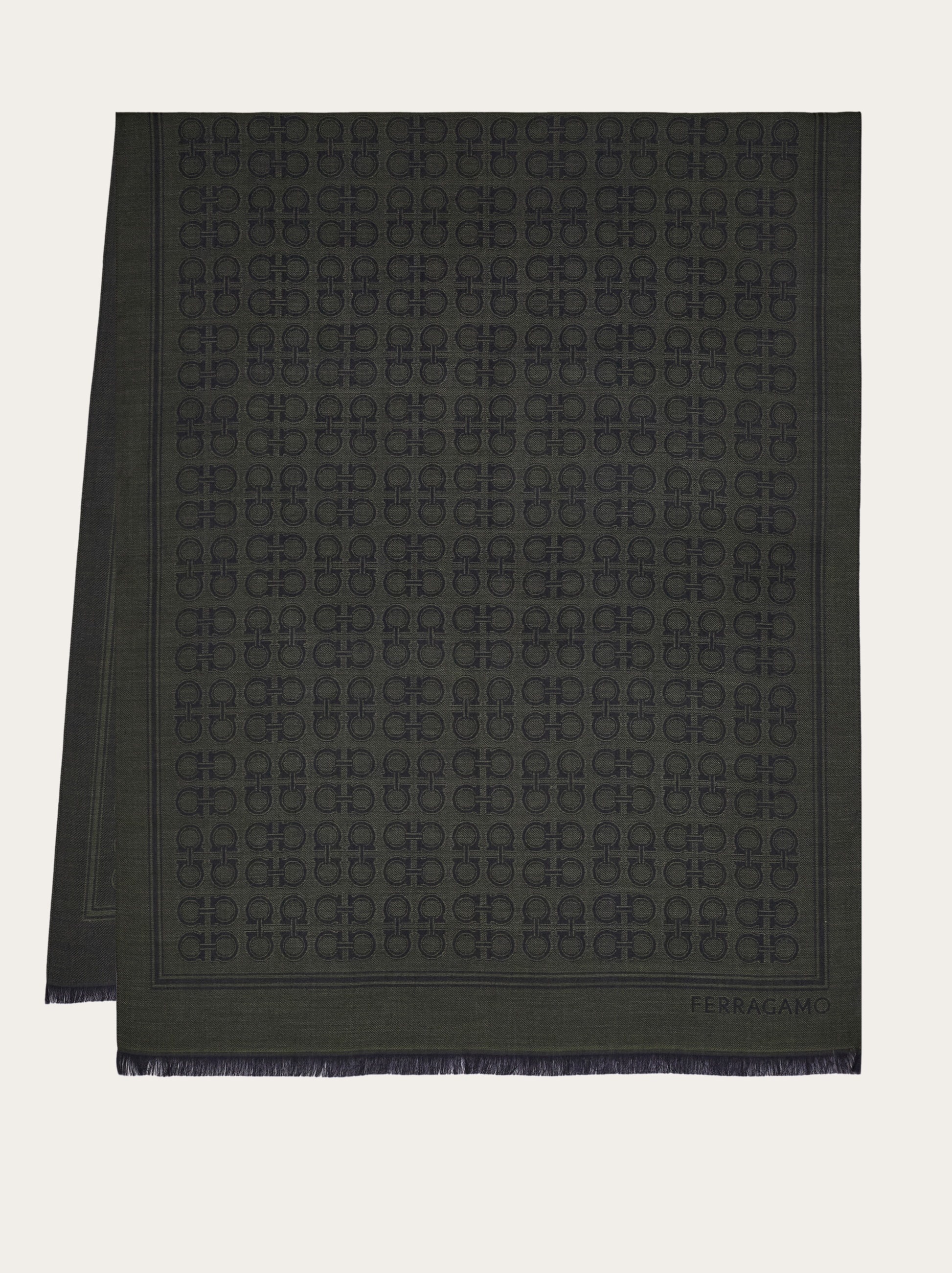 Subtle and extremely sophisticated, this pure wool and silk shawl is covered in a geometric pattern of the iconic Gancini. A tonal frame completes the design with fringed edges and tonal logo in the bottom corner. - length 70.8 IN width 27.5 IN - Composition: 90% pure virgin wool, 10% silk - Made in ITALY - Product code: 520144 785250