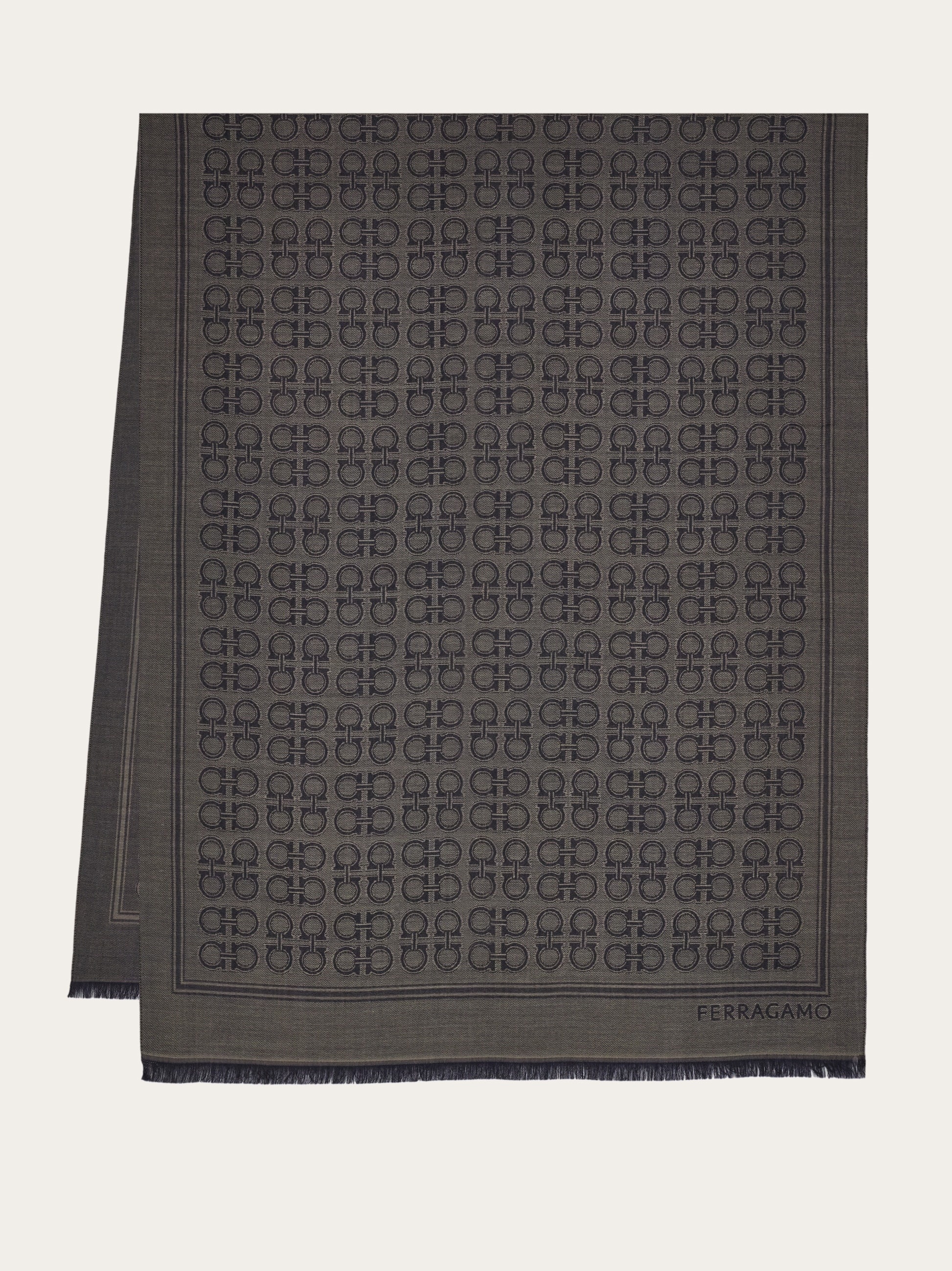 Subtle and extremely sophisticated, this pure wool and silk shawl is covered in a geometric pattern of the iconic Gancini. A tonal frame completes the design with fringed edges and tonal logo in the bottom corner. - length 70.8 IN width 27.5 IN - Composition: 90% pure virgin wool, 10% silk - Made in ITALY - Product code: 520144 785251