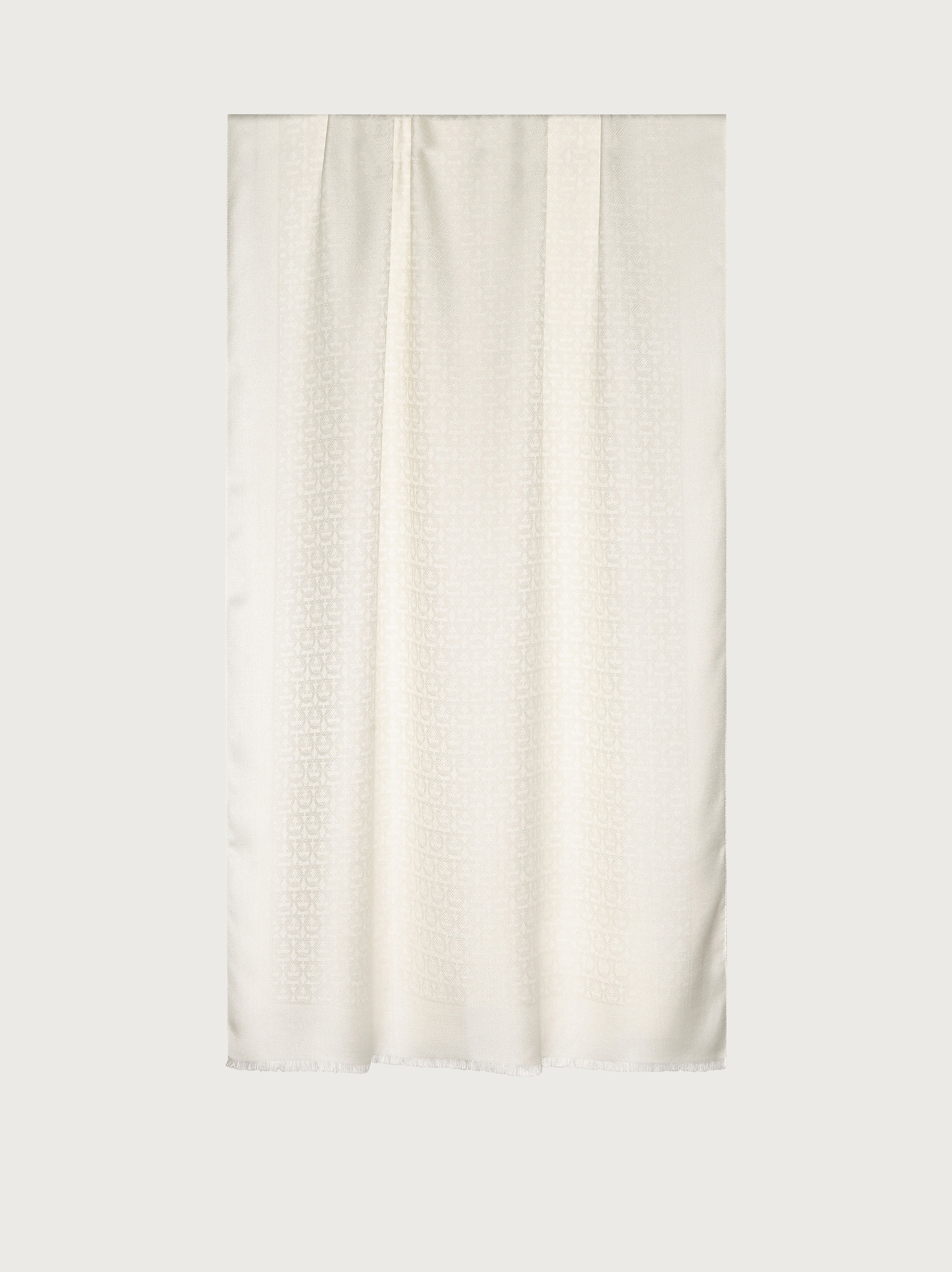 Light, soft and enveloping, this stole is the perfect complement for every moment of the day. The elegant jacquard woven Gancini pattern is finished off with a wide border with Ferragamo lettering. For refined styling with timeless style. - length 70.8 IN width 27.5 IN - Composition: 75% silk, 25% wool - Made in ITALY - Product code: 327987 725360
