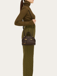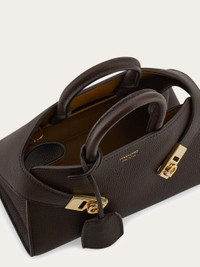 Two-tone iteration of the Ferragamo Hug bag, a new contemporary icon made of hammered calfskin, vegetable dyed and tumbled for a rich, pebbled finish. The silhouette features an asymmetrical back panel that wraps around to ‘hug’ the front one via two wide leather straps with custom golden Gancini clasps. It fastens on the inside with a metallic ring, the lined interior features a zip pocket, and a tonal leather fob is placed on the rigid top handle. Rectangular foot studs protect the base and confirm her iconic status. - height 5.5 IN length 8.8 IN width 4.3 IN - Composition: hammered calfskin - Made in ITALY - Product code: 215975 778490