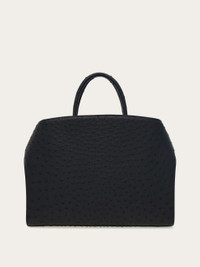 When the briefcase meets high fashion: Ferragamo business bag, the Hug edition. Made of exclusive ostrich leather with a high-end feel, this workwear iteration of the Hug follows the iconic outline, with wide straps that wrap the sides, and fasten at the front via Gancio clasps. A tonal key fob hangs from the rigid top handle, and the top zip opens to a fully organized interior. - height 12.2 IN length 15.7 IN width 3.1 IN - Composition: ostrich leather - Made in ITALY - Product code: 241683 789874