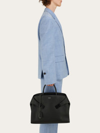 When the briefcase meets high fashion: Ferragamo business bag, the Hug edition. Made of robust hammered leather with a dappled texture, this workwear iteration of the Hug follows the iconic outline, with wide straps that wrap the sides, and fasten at the front via Gancio clasps. A tonal key fob hangs from the rigid top handle, and the top zip opens to a fully organized interior. - height 12.2 IN length 15.7 IN width 3.1 IN - Composition: hammered calfskin - Made in ITALY - Product code: 241683 779072