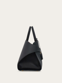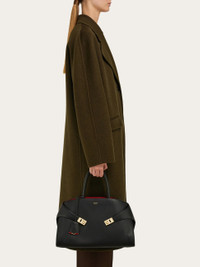 New retro-inspired top-handle bag featuring a soft structure and shiny calfskin panels. Large and spacious, it features a special construction with an asymmetrical back that surrounds the accordion details on the sides and fastens with the golden-finish Gancini buckles. It fastens on the inside with a ring and is complemented by the keyring charm and zipped lined pocket. The branded rectangular feet studs ensure protection for the base. - A) Height 9.4 IN B) Length 14.9 IN C) Width 8.6 IN - Composition: calfskin - Handle drop: 5.5 in/14 cm - Large - Made in ITALY - Product code: 215921 767651