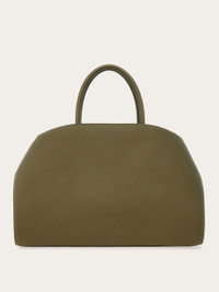 The Ferragamo Hug bag, a new contemporary icon, is reintroduced this season in hammered calfskin, vegetable dyed and tumbled for a rich, pebbled finish. The silhouette features an asymmetrical back panel that wraps around to ‘hug’ the front one via two wide leather straps with custom Gancini clasps. It fastens on the inside with a metallic ring, the lined interior features a zip pocket, and a tonal leather fob is placed on the rigid top handle. Rectangular foot studs protect the base and confirm her iconic status. - A) Height 9.4 IN B) Length 14.9 IN C) Width 8.6 IN - Composition: hammered calfskin - Handle drop: 5.5 in/14 cm - Large - Made in ITALY - Product code: 215921 777257
