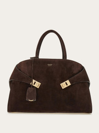 A retro-inspired take on the top handle bag, featuring a soft paneled construction in buttery soft suede. Spacious and perfectly organized, the special design features an asymmetrical back from which two wide straps wrap the side bellows and fasten on the front panel via palladium-toned Gancini buckles. The internal compartment has a ring closure, and is fitted with a lined zip pocket. A keychain charm dangles from the top handle, while custom metal studs protect the base. - A) Height 9.4 IN B) Length 14.9 IN C) Width 8.6 IN - Composition: suede - Handle drop: 5.5 in/14 cm - Large - Made in ITALY - Product code: 219915 779241