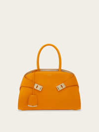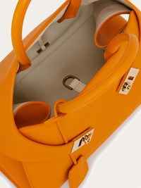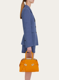 Retro-inspired top-handle Hug bag with a semi-soft structure cut from naturally grainy calfskin leather . The Ferragamo Hug features two wide leather straps which wrap the side bellows and fasten on the front panel via golden Gancio buckles, and the well-organized interior has a zip pocket, and is closed via a golden ring. A covered key charm hangs from the top handle, and custom studs protect the base. - A) Height 8.6 IN B) Length 12.4 IN C) Width 7.4 IN - Composition: calfskin - Handle drop: 5.5 in/14 cm - Medium - Made in ITALY - Product code: 215608 784585