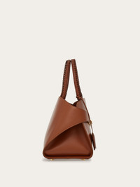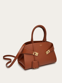 Braided leather accents add an artisanal twist to the new, compact version of the Hug silhouette. Made of the softest calfskin, braided leather wraps the top handle and trim of the keyring fob for an exclusive finish. The silhouette is textbook, with two wide straps that reach around from the asymmetrical back panel to wrap the side bellows and fasten on the front via golden Gancio buckles. Custom studs protect the base. Removable leather shoulder strap for hands free style. - A) Height 8.6 IN B) Length 12.4 IN C) Width 7.4 IN - Composition: calfskin - Handle drop: 5.5 in/14 cm - Medium - Made in ITALY - Product code: 219451 774744