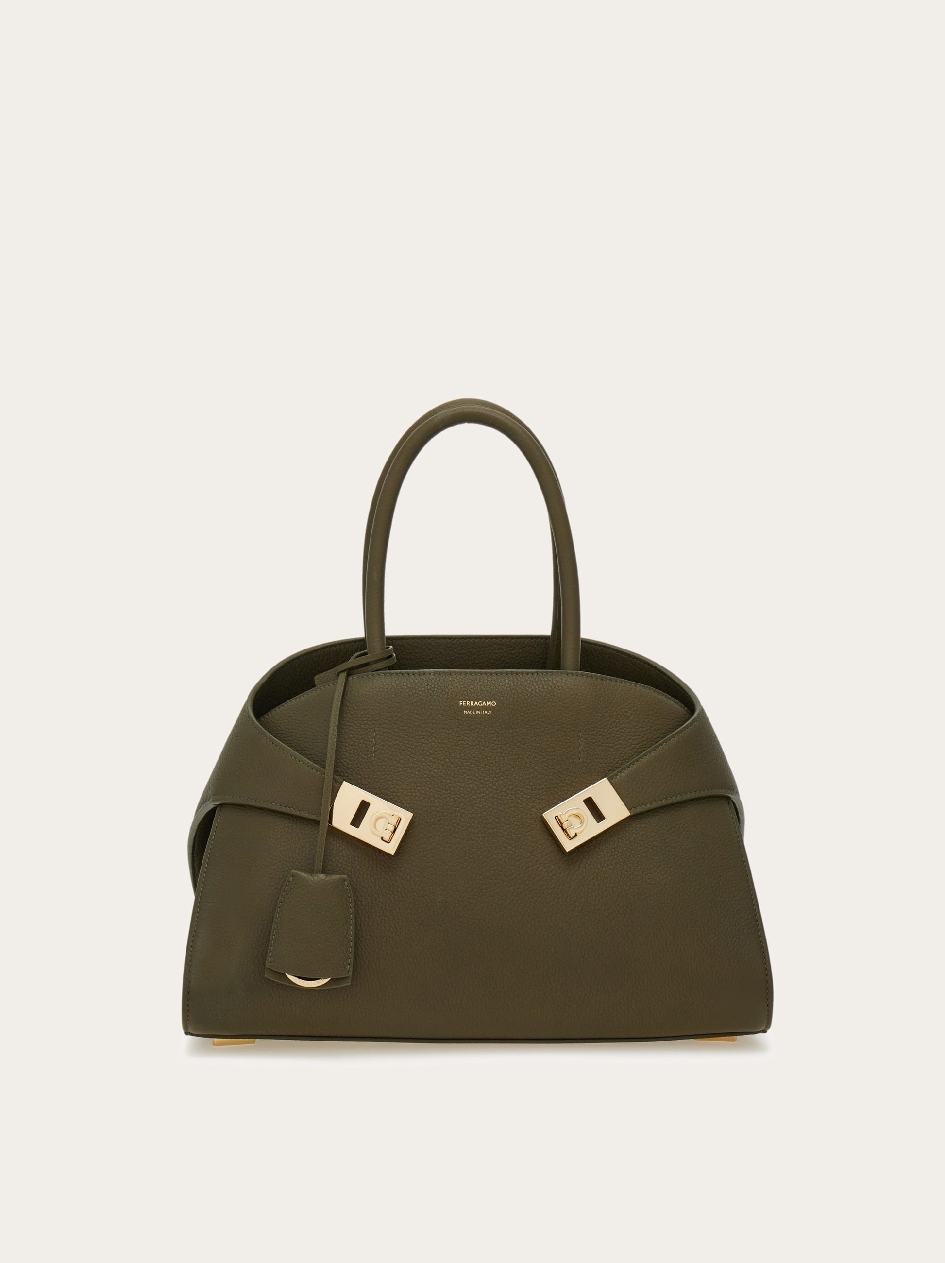The Ferragamo Hug bag, a new contemporary icon, is reintroduced this season in hammered calfskin, vegetable dyed and tumbled for a rich, pebbled finish. The silhouette features an asymmetrical back panel that wraps around to ‘hug’ the front one via two wide leather straps with custom Gancini clasps. It fastens on the inside with a metallic ring, the lined interior features a zip pocket, and a tonal leather fob is placed on the rigid top handle. Rectangular foot studs protect the base and confirm her iconic status. - A) Height 8.6 IN B) Length 12.4 IN C) Width 7.4 IN - Composition: hammered calfskin - Handle drop: 5.5 in/14 cm - Medium - Made in ITALY - Product code: 215608 777523
