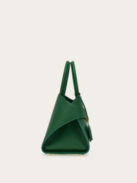 The Ferragamo Hug bag, a new retro-inspired top handle with a sophisticated allure. Made of calfskin with a natural grainy finish, this compact iteration is faithful to the original, with an asymmetrical back panel that wraps around to ‘hug’ the front one via two wide leather straps with custom Gancio clasps. It fastens on the inside with a metallic ring, the lined interior features a zip pocket, and a tonal leather fob is placed on the rigid top handle. Rectangular foot studs provide protection and confirm her iconic status. - A) Height 8.6 IN B) Length 12.4 IN C) Width 7.4 IN - Composition: calfskin - Handle drop: 5.5 in/14 cm - Medium - Made in ITALY - Product code: 215608 773196