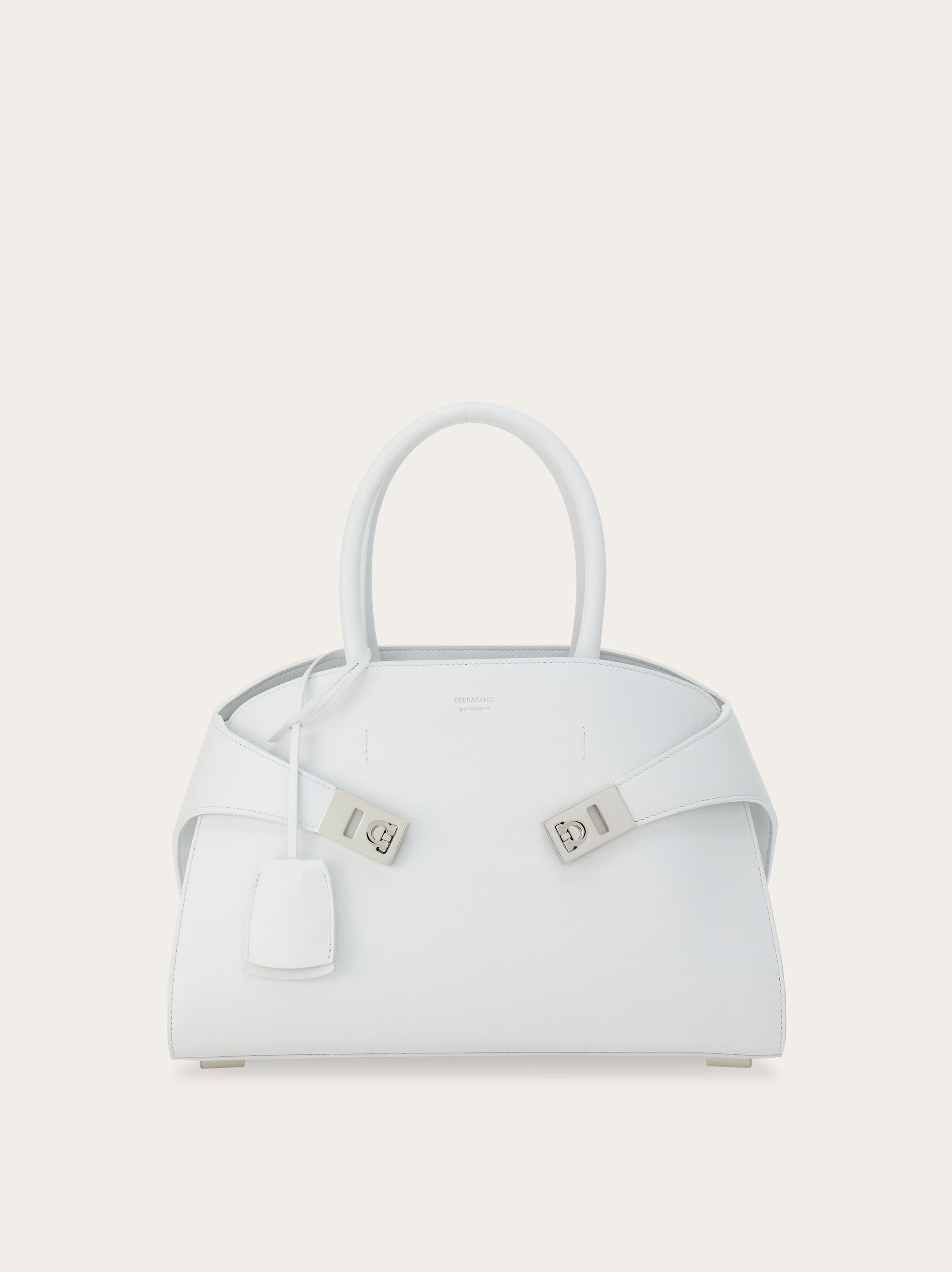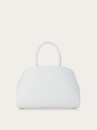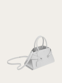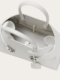 New retro-inspired top-handle bag featuring a soft structure and natural-grain calfskin panels. This compact version features a construction with asymmetrical back that wraps the accordion sides and fastens with the palladium-finish Gancini buckles. It fastens on the inside with a ring and is complemented by the keyring charm and zipped lined pocket. The branded rectangular feet studs ensure protection for the base. - A) Height 8.6 IN B) Length 12.4 IN C) Width 7.4 IN - Composition: calfskin - Handle drop: 5.5 in/14 cm - Medium - Made in ITALY - Product code: 215608 766759