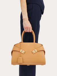 New retro-inspired top-handle bag featuring a soft structure and natural-grain calfskin panels. This compact version features a construction with asymmetrical back that wraps the accordion sides and fastens with the golden-finish Gancini buckles. It fastens on the inside with a ring and is complemented by the keyring charm and zipped lined pocket. The branded rectangular feet studs ensure protection for the base. - A) Height 8.6 IN B) Length 12.4 IN C) Width 7.4 IN - Composition: calfskin - Handle drop: 5.5 in/14 cm - Medium - Made in ITALY - Product code: 215608 769115