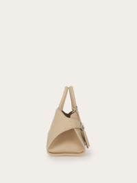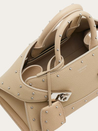 A studded edition of the Ferragamo Hug bag, in hammered calfskin leather. This unique piece features a layered structure embellished with metallic studs. The iconic structure includes wrap around straps with Gancio buckles and a covered keyring that dangles from the rigid top handle. - A) Height 5.5 IN B) Length 8.8 IN C) Width 4.3 IN - Composition: hammered calfskin - Handle drop: 2.9 in/7,5 cm - Extra Small - Made in ITALY - Product code: 21A263 786917