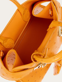 This ultra-glam take on the Ferragamo Hug bag is cut from precious ostrich leather. Compact yet capacious, the side straps can be secured via the Gancini buckles or left open for extra room. Signature features include a covered keyring which dangles playfully from the top handle, and custom studs on the base. Adjustable, removable shoulder strap. - A) Height 5.5 IN B) Length 8.8 IN C) Width 4.3 IN - Composition: ostrich leather - Handle drop: 2.9 in/7,5 cm - Extra Small - Made in ITALY - Product code: 219610 787051
