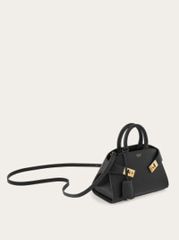 Made of the softest leather with a natural grainy texture, this compact version of the Hug bag is uptown style at its best. The rounded edges bring a softness to the rigid structure, echoed by the two straps that emanate from the back quadrant and wrap the billows, fastening at the front via two golden Gancio buckles. The look is ladylike contemporary, with a keychain charm on the zip ring, and detachable shoulder strap for handsfree styling. - A) Height 5.5 IN B) Length 8.8 IN C) Width 4.3 IN - Composition: calfskin - Handle drop: 2.9 in/7,5 cm - Extra Small - Made in ITALY - Product code: 215975 768853