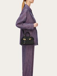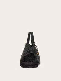 The unique Hug silhouette is brought to life in hand-woven raffia-effect fabric in seasonal hues. Compact and cool, it has wide straps that wrap the sides and fasten at the front via two golden Gancio buckles, and leather top handles with leather fob. The unlined interior is reinforced by a leather panel at the base, and has a leather slot on the back panel. Removable shoulder strap. - A) Height 6.1 IN B) Length 9.4 IN C) Width 4.3 IN - Composition: calfskin and raffia-effect fabric - Handle drop: 2.9 in/7,5 cm - Extra Small - Made in ITALY - Product code: 219397 774168
