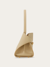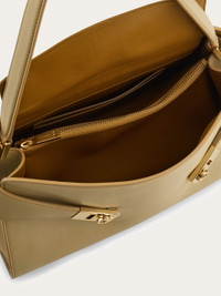 The Hug Soft shoulder bag features the distinctive enveloping shape of the Hug in a deconstructed version. Made of calfskin it features a single handle for a softer silhouette on the front panel, which is decorated with golden Gancini buckles. Closed with an internal flap equipped with magnets and a practical T-bar, this version features a contrasting lining for a refined color block effect. The central zipped compartment divides the interior into perfectly organized sections. Adjustable and detachable strap for multiple styling options. - A) Height 10.0 IN B) Length 13.3 IN C) Width 6.1 IN - Composition: calfskin - Handle drop: 7.2 in/18,5 cm - Medium - Made in ITALY - Product code: 219816 780594