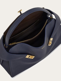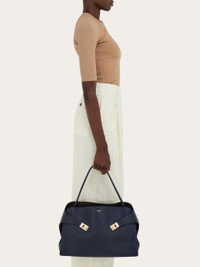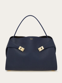 A deconstructed take on the Ferragamo Hug bag, with a single handle for a more relaxed look. Contrasting lining peeps out from the higher back panel, as two wide straps wrap the side bellows and can be secured to the front panel via Hug buckles or left open for extra room. The magnetic clasp, with additional T-bar loop, opens to reveal a fully organized interior, with zip pocket and two spacious side compartments. - A) Height 12.0 IN B) Length 15.7 IN C) Width 5.9 IN - Composition: calfskin - Handle drop: 6.5 in/16,5 cm - Large - Made in ITALY - Product code: 219939 789712