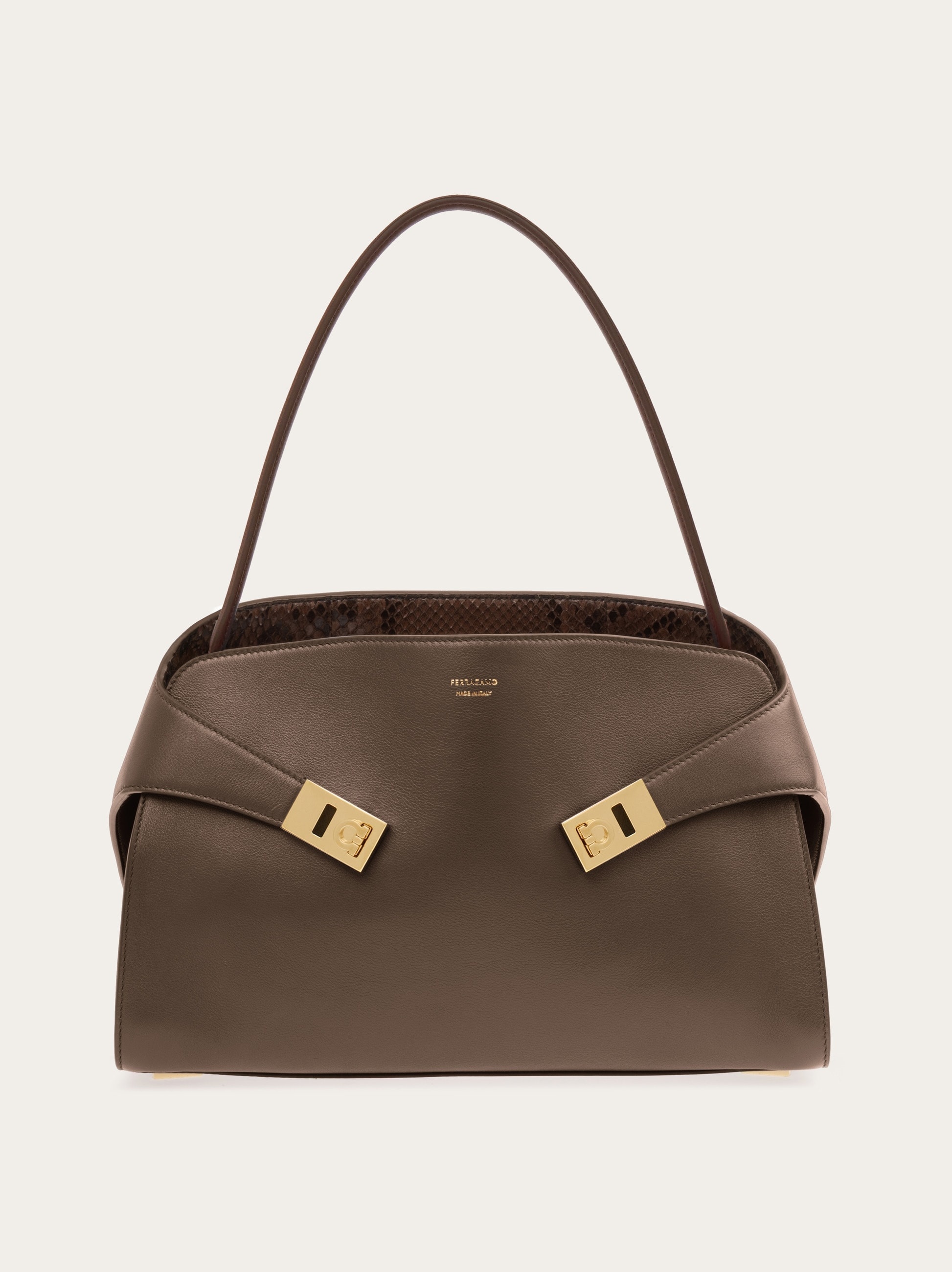 A harmonious blend of clean lines and distinctive accents define this take on the iconic Hug. The Soft Hug bag by Ferragamo, an intriguing silhouette cut from smooth calfskin with python leather inserts that elevate its sense of luxury. Golden hardware confirms its high end status. Removable shoulder strap. - A) Height 10.0 IN B) Length 13.3 IN C) Width 6.1 IN - Composition: calfskin and python - Medium - Made in ITALY - Product code: 21A214 784063