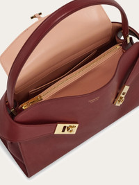 A harmonious blend of clean lines and distinctive accents define this take on the iconic Hug. The Soft Hug bag by Ferragamo, an intriguing silhouette cut from smooth calfskin with striking two tone details. Golden hardware confirms its high end status. Removable shoulder strap. - A) Height 10.0 IN B) Length 13.3 IN C) Width 6.1 IN - Composition: calfskin - Handle drop: 7.2 in/18,5 cm - Medium - Made in ITALY - Product code: 219816 783840