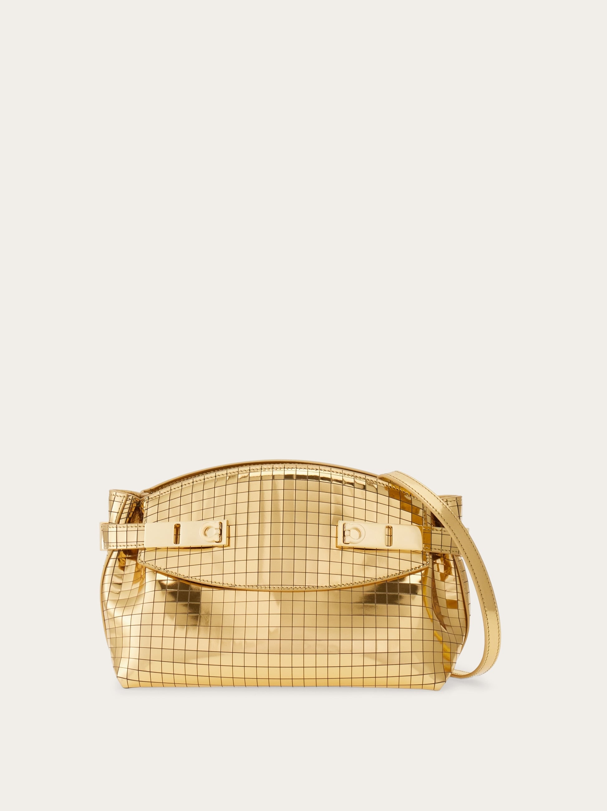 Bright as a disco ball, this crossbody Hug bag is the epitome of contemporary glamour. Made of mirror laminated lasered calfskin leather, it follows the iconic line with a soft shape featuring side straps that cinch the gussets and clip at the front with two golden Gancio buckles. Practical details include two internal slots for cards and documents, and a magnetic clasp. It can be carried as a clutch or worn over the shoulder via the removable strap. - A) Height 5.9 IN B) Length 9.4 IN C) Width 4.7 IN - Composition: laminated and lasered calfskin - Extra Small - Made in ITALY - Product code: 219948 781445