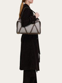 This Hug soft bag stands out thanks to its canvas-like look: the cotton base fabric is woven with a mix of yarns derived from upcycled leather, combined with other fibers to create the final textured appearance. Diagonal leather stripes form a distinctive diamond pattern, offering a fresh interpretation of this model. The diagonal stripes create bold geometric patterns, in line with the contemporary mood of the design. Lined interior with flat pocket. - A) Height 12.0 IN B) Length 15.7 IN C) Width 5.9 IN - Composition: canvas and calfskin - Handle drop: 5.5 in/14 cm - Large - Made in ITALY - Product code: 21A255 785998