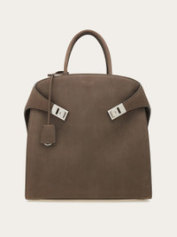 Since its launch the Ferragamo hug bag has become a contemporary icon. This gentlemen's iteration in hammered calfskin is luxurious and spacious. Faithful to the original silhouette, it has an asymmetrical back panel that wraps around to ‘hug’ the front one via two wide straps with custom Gancini clasps. The lined interior features a zip pocket, and a tonal leather fob is placed on the rigid top handle. Rectangular foot studs protect the base and confirm his iconic status. A removable leather strap offers hands-free style. - height 15.3 IN length 14.9 IN width 5.9 IN - Composition: nubuck - Made in ITALY - Product code: 241666 782576