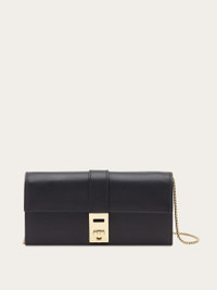 The contemporary elegance of the Hug collection is attested to in this new wallet too, boasting a wide, spacious design with a plain calfskin structure and the iconic golden-finish Gancini fastening. The double-compartment interior with several card slots is complemented by a zipped coin pocket in the center and a detachable metal chain strap so you can also carry it as a mini bag. Versatility and style, in a single accessory. - height 3.7 IN length 7.6 IN width 0.9 IN - Composition: calfskin - 10 card slots, 3 pockets, 2 compartments, 1 coin zip pocket - Made in ITALY - Product code: 220668 775132