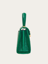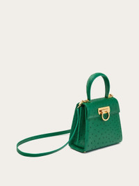 Small top handle bag in ostrich with a gold Gancini clasp. Iconic Top Handle bag is a re-release of one of the Ferragamo brand’s best known styles and it embodies the many facets of the female essence, starting from the wide range of colours and materials available. Its extremely versatile size makes it the perfect companion for any occasion. A true symbol of Ferragamo style, as unique as the woman who owns it. - A) Height 7.0 IN B) Length 8.0 IN C) Width 3.9 IN - Composition: ostrich - Handle drop: 3.9 in/10 cm - Small - Made in ITALY - Product code: 212270 760287