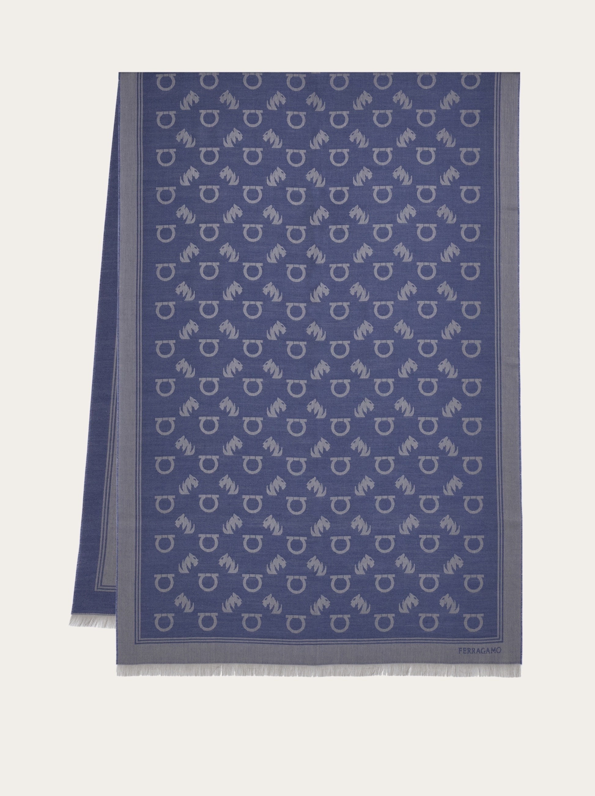 The stylized squiggle on this jacquard stole draws a feline figure. Interspersed with Gancini symbols, the regal pattern is encased by a tonal frame. - length 80.7 IN width 27.5 IN - Composition: 61% lyocell, 27% pure virgin wool, 12% silk - Made in ITALY - Product code: 520141 785238