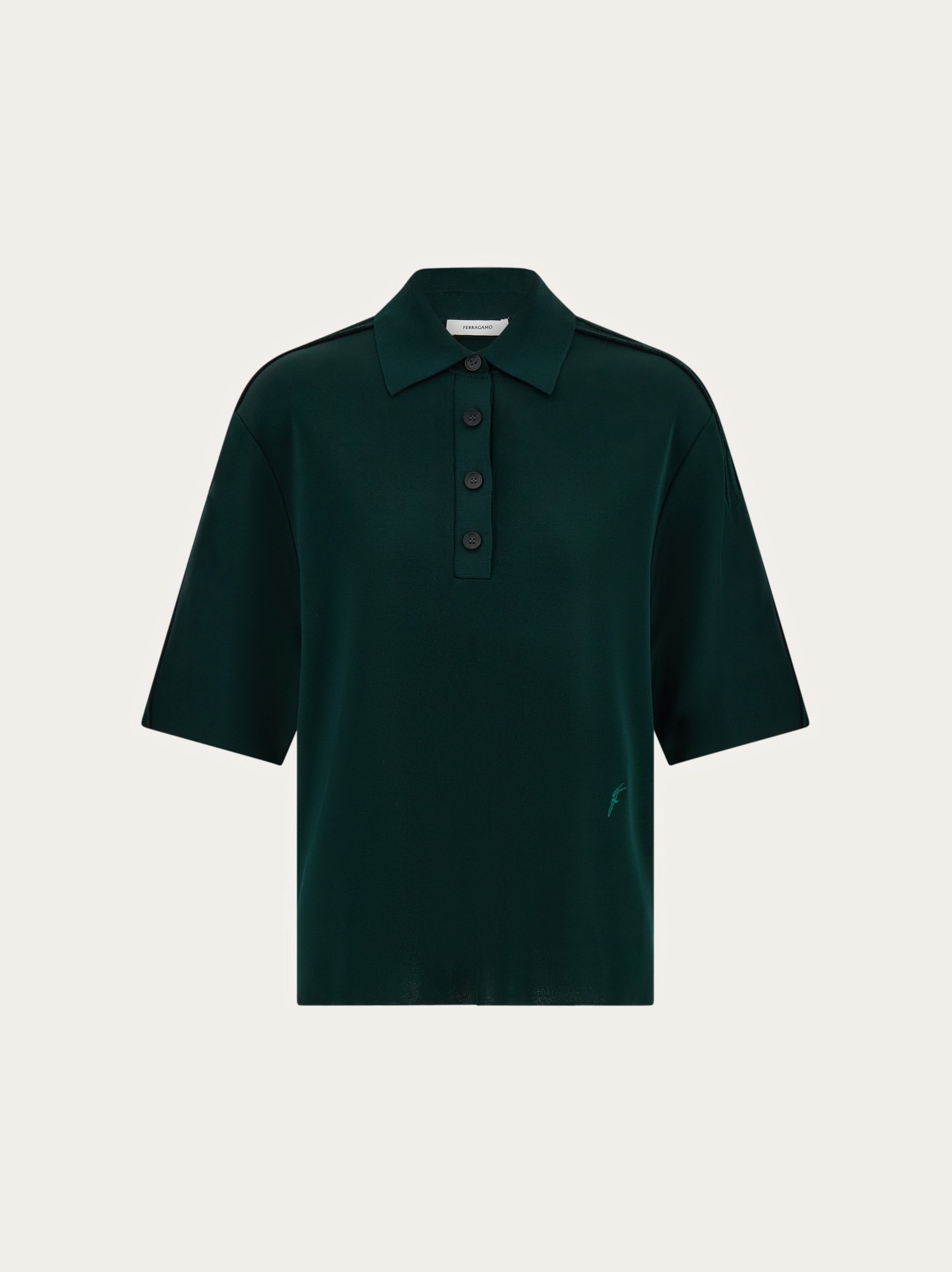 A classic silhouette revised in a sophisticated key, this short-sleeved polo is knitted from pure viscose. The impeccable drape of the fabric draws a contemporary silhouette with button-up collar and asymmetrical side slits. A tonal embroidered F completes the design. - Composition: 100% viscose - Model measurements: Height 5' 10"/178 cm; Bust 32 / 81cm; Waist 25"/63 cm; Hips 34½"/88 cm - Model wearing: 38/XS - Made in ITALY - Product code: 13H146 786226