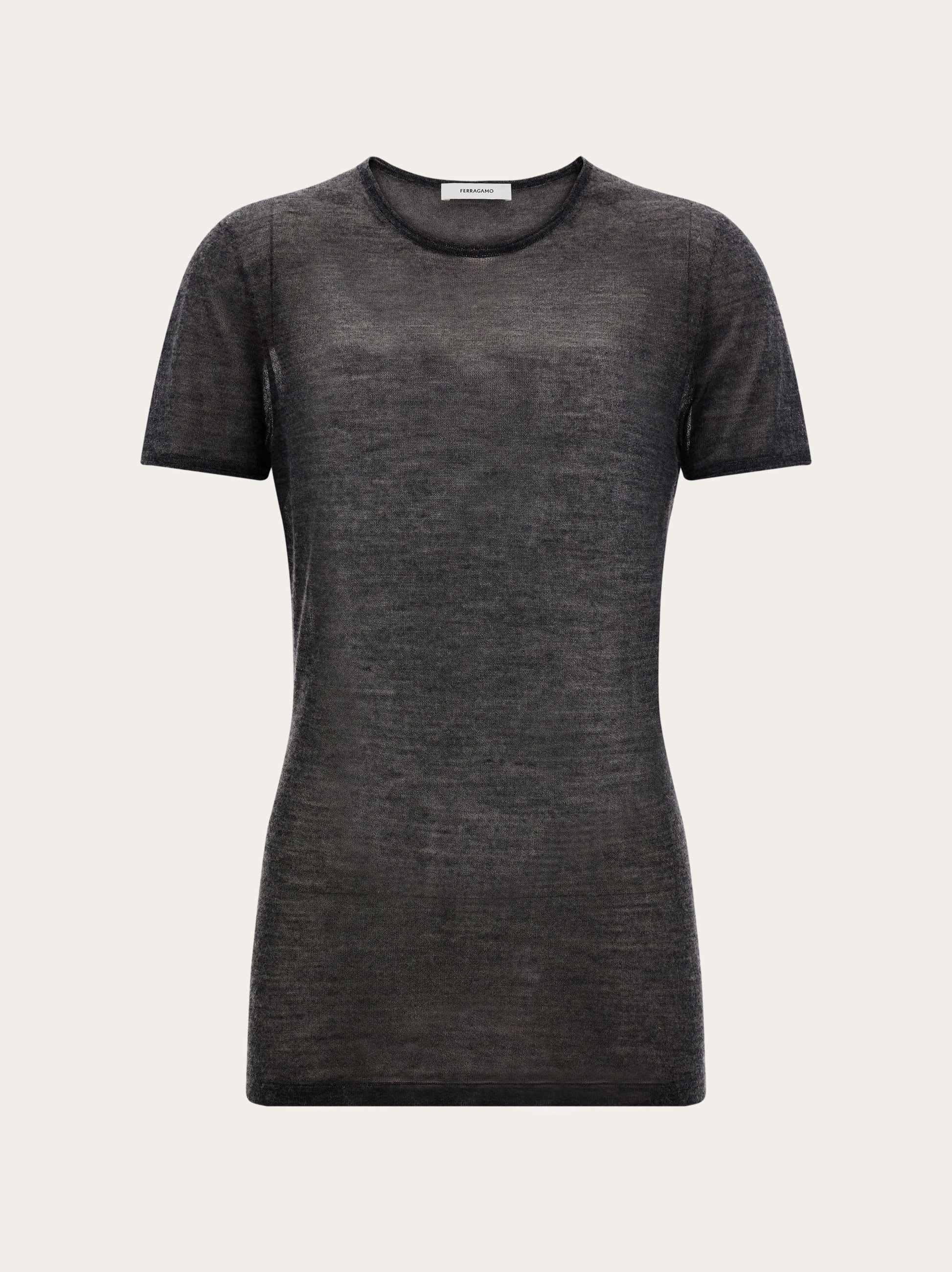 With its minimal silhouette made from a fine blend of wool and cashmere, this knitted crew neck T-shirt is ideal for luxurious layering. Its delicate transparency features a seamless outline with hand-applied trims on the neckline and sleeve edges. - Composition: 70% cashmere, 30% silk - Made in ITALY - Product code: 13H698 788106