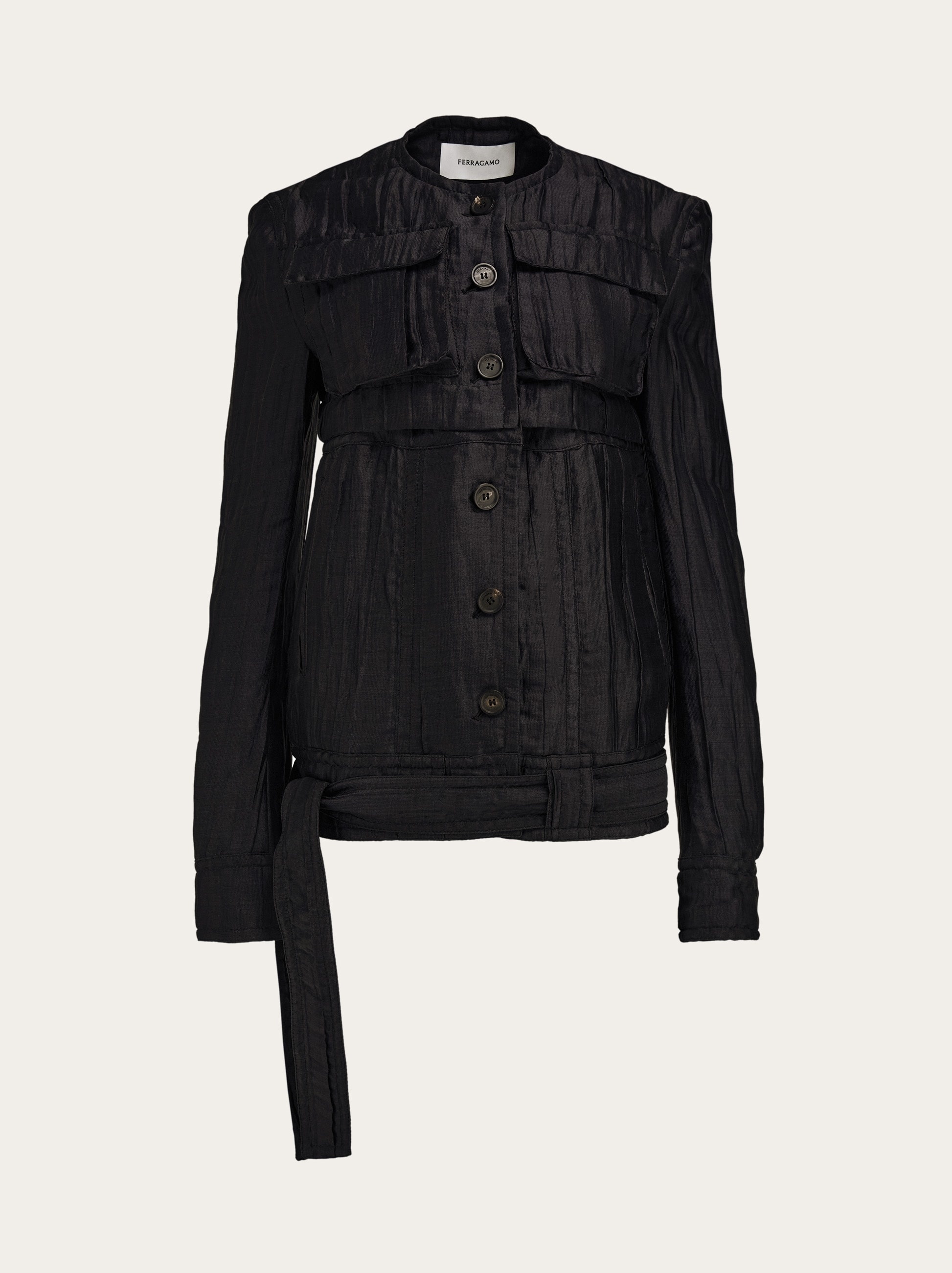 Utility details and luxurious materials confirm the contemporary elegance of this lightweight jacket. Made from a blend of silk organza, the delicate fabric softens the androgynous silhouette with a cut under the bust which can be unbuttoned to remove the bottom section leaving a cropped jacket. - Composition: 84% silk, 16% polyamide - Model measurements: Height 5' 11"/180 cm; Bust 33"/84 cm; Waist 23½"/60 cm; Hips 34½"/88 cm - Model wearing: 38 - Made in ITALY - Product code: 13G753 782570