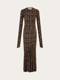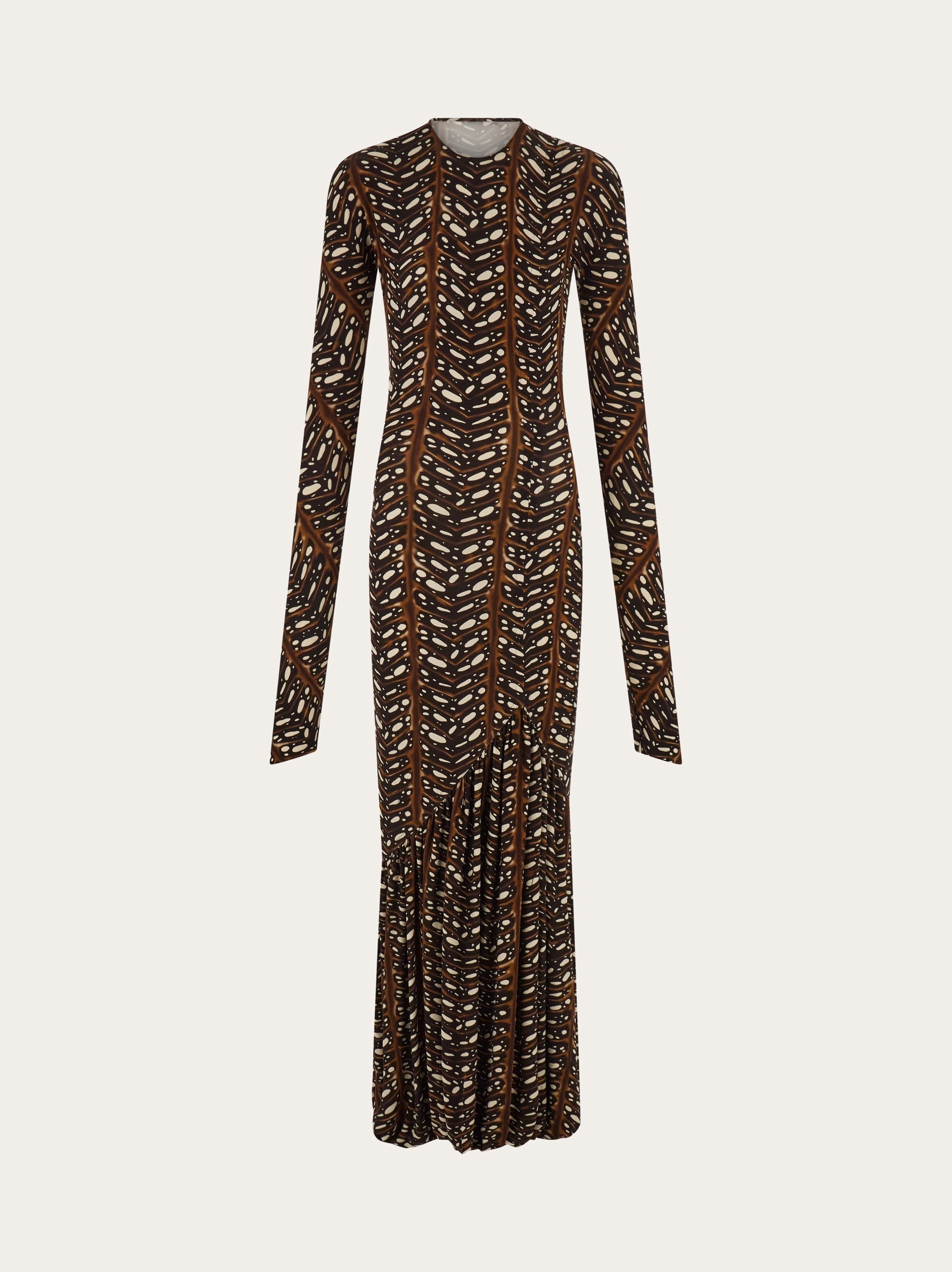 The comfort of stretch jersey with the cachet of couture. Longline dress with a figure hugging silhouette, asymmetric hem with bubble-like turn up that adds volume and movement. The exotic pattern adds a glam twist to this easy to wear piece with clean-cut round neck and extra-long sleeves. - Composition: 95% viscose, 5% elastane - Model measurements: Height 5' 9"/175 cm; Bust 30"/76 cm; Waist 24"/61 cm; Hips 34½"/87 cm - Model wearing: 38/XS - Made in ITALY - Product code: 13H408 785552