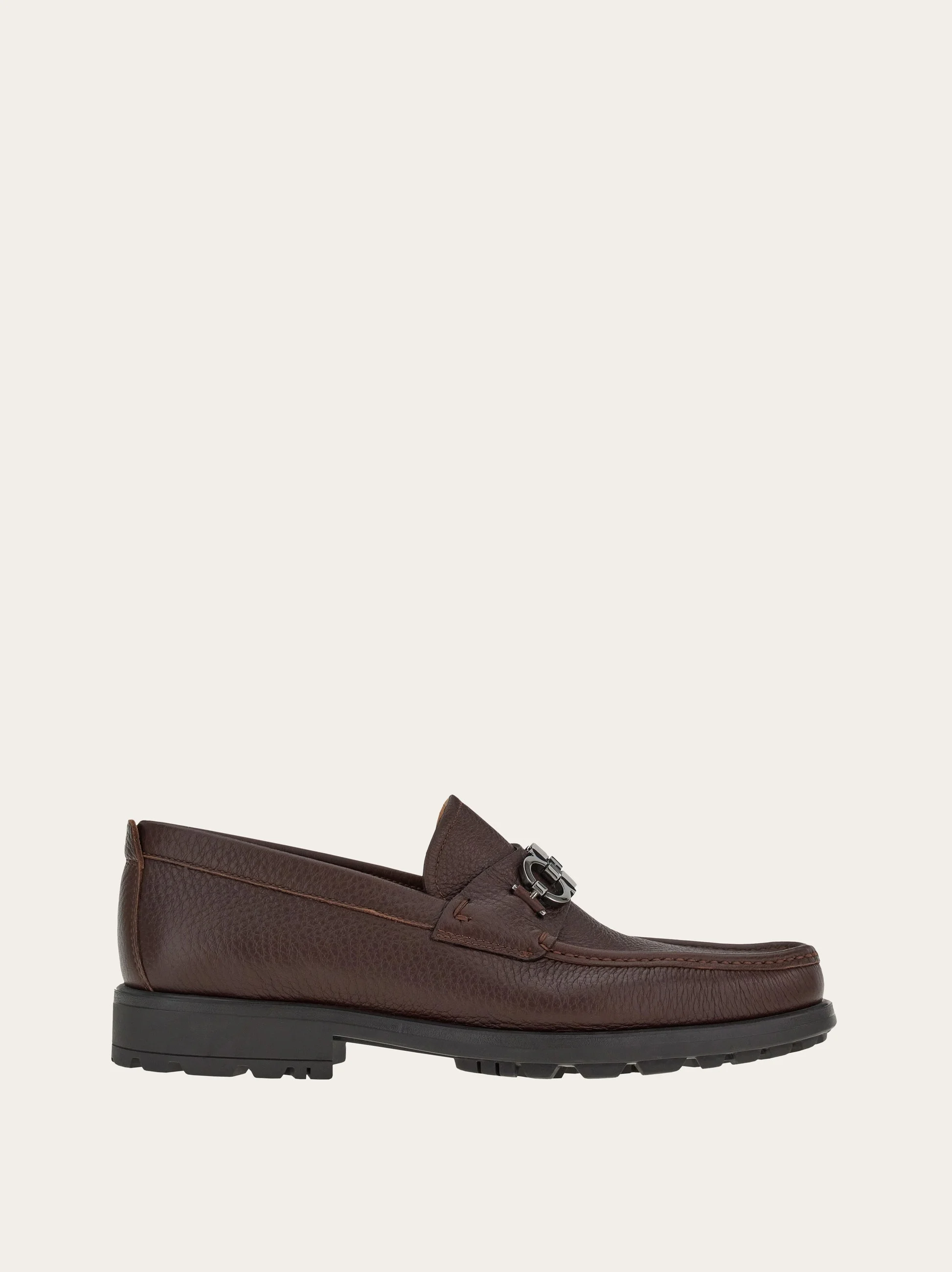 This classic loafer has an urban feel with a stitched vamp and Gancini bit in graphite finish. The thick rubber sole and the lug bottom add a metropolitan appeal. This shoe is made with the "Tubular" technique, an exclusive method applied by high end shoemakers, whereby the sole is hand-sewn to ensure a supple, flexible finish. - Composition: calfskin - Made in ITALY - Product code: 02A515 781910