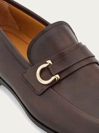 Formal-feel loafers with a soft calfskin upper and a double flat strap on the saddle detail adorned by a golden-finish Gancini accent. The richness of the leather is emphasized by the special construction of the apron, which is embraced by the structure of the upper. The almond toe and the leather sole with rubber heel finish off the design. - Composition: calfskin - Made in ITALY - Product code: 021688 774131