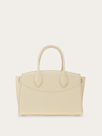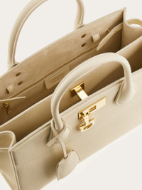 A new edition to the Ferragamo Studio line, the Soft bag, cut from rich Italian calfskin. The dappled texture of the hammered leather echoes the sumptuous feel of this capacious accessory with ample slide bellows and tonal top handle. The suede lined interior fastens via an iconic Gancio slider clasp, with tonal covered keyring for a playful note. Custom studs protect the base. Adjustable removable shoulder strap. - A) Height 7.2 IN B) Length 11.0 IN C) Width 4.9 IN - Composition: hammered calfskin - Handle drop: 4.3 in/11 cm - Medium - Made in ITALY - Product code: 21A112 786170