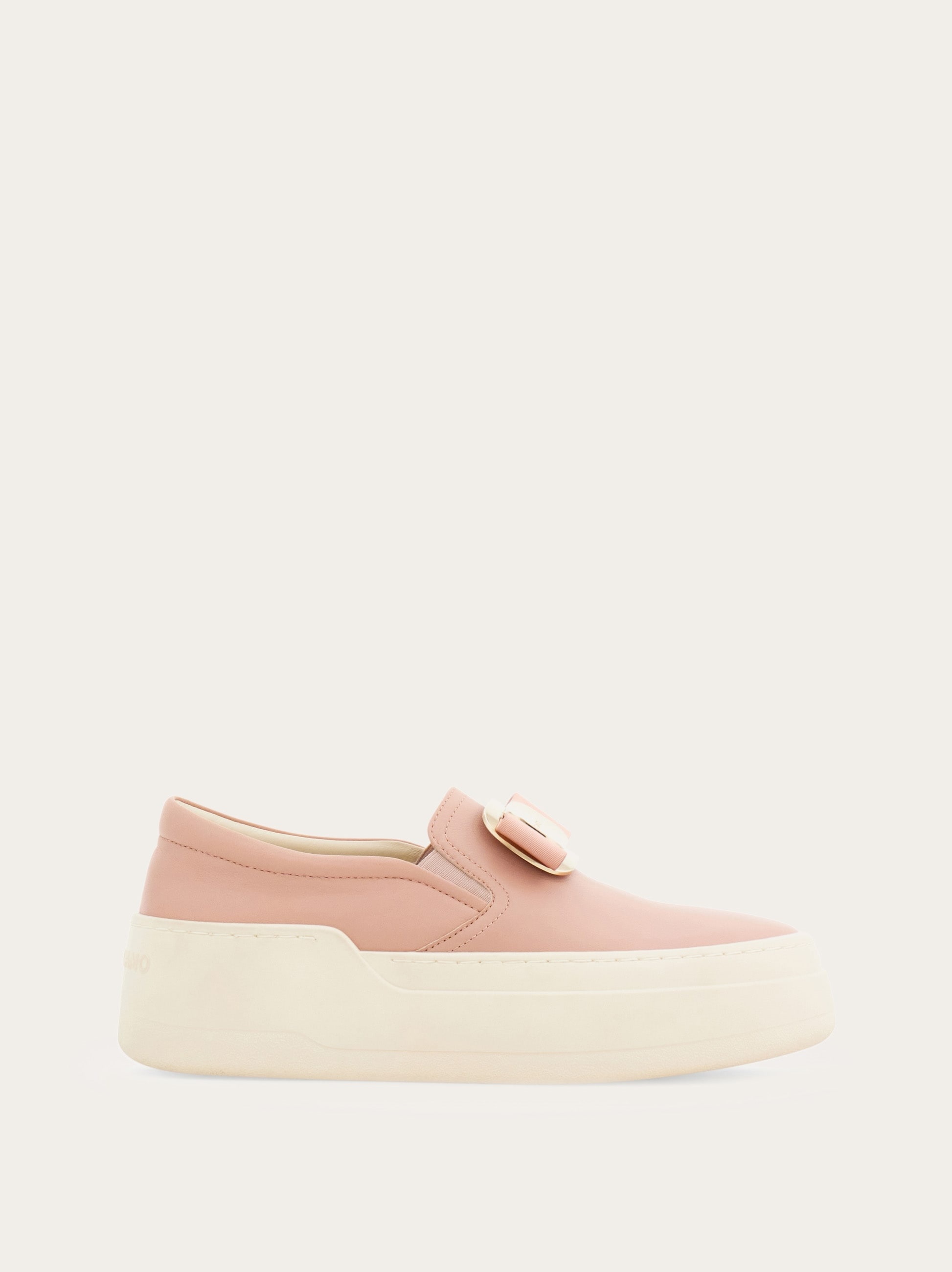 The slip-on sneaker is a versatile and stylish option for casual occasions. The nappa leather upper is soft and adorned with a new golden Vara buckle, featuring an on-tone grosgrain bow for a feminine touch. Elastic bands and padding along the neckline provide a comfortable fit. The rubber platform sole is lightweight and has custom detailing. - Composition: nappa - Made in ITALY - Product code: 030606 774816