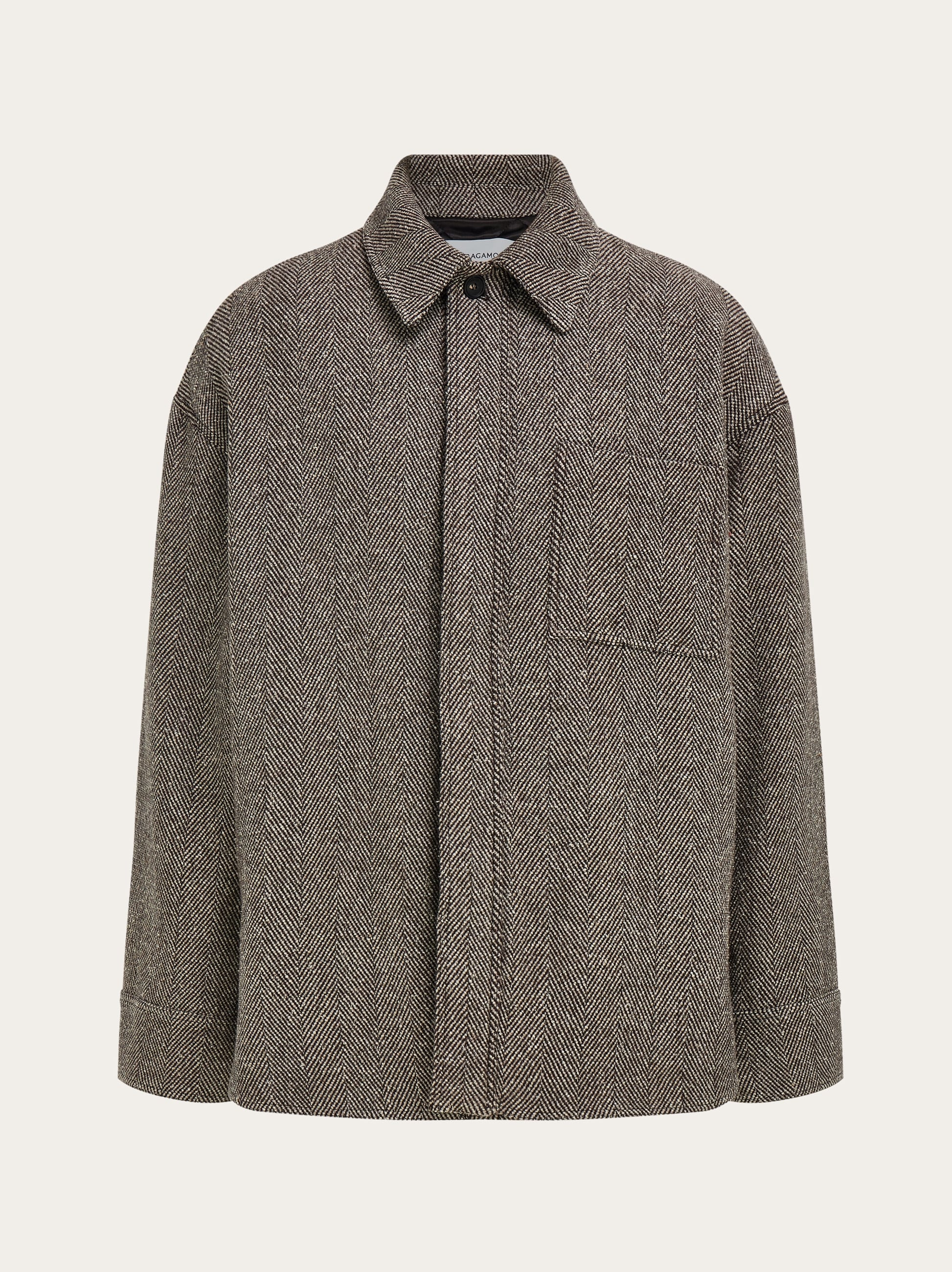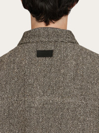 Chevron: a seamless fabric with an inverted V pattern and striking tactile texture. This overshirt, with its relaxed fit, has internal padding and is embellished with sheepskin panels on the front. The dropped shoulder and covered button echo a contemporary aesthetic, with shirt cuffs and an asymmetrical, rounded hem. Leather tab at the back of the neck. - Composition: 83% pure virgin wool, 17% cotton - Made in ITALY - Product code: 144953 788830
