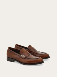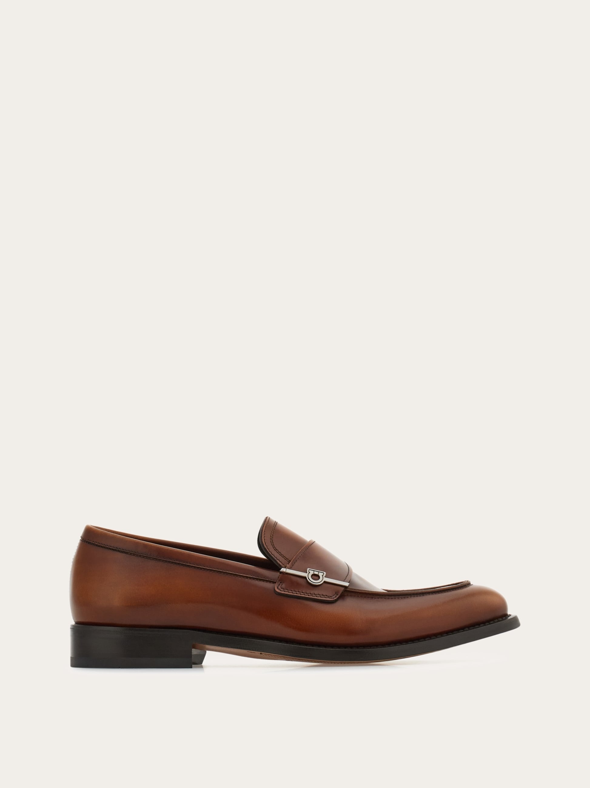 Smooth calfskin leather loafer with an uptown appeal. Visible stitching draws a strong outline around the vamp, with a ruthenium finish Gancio buckle at the side of the saddle strap. The open channel leather sole features contrasting red stitching. This gentlemen’s slip on is made according to the “Originali” construction method, whereby the sole is applied almost entirely by hand by highly specialized craftsmen. - Composition: calfskin - Made in ITALY - Product code: 029556 781304
