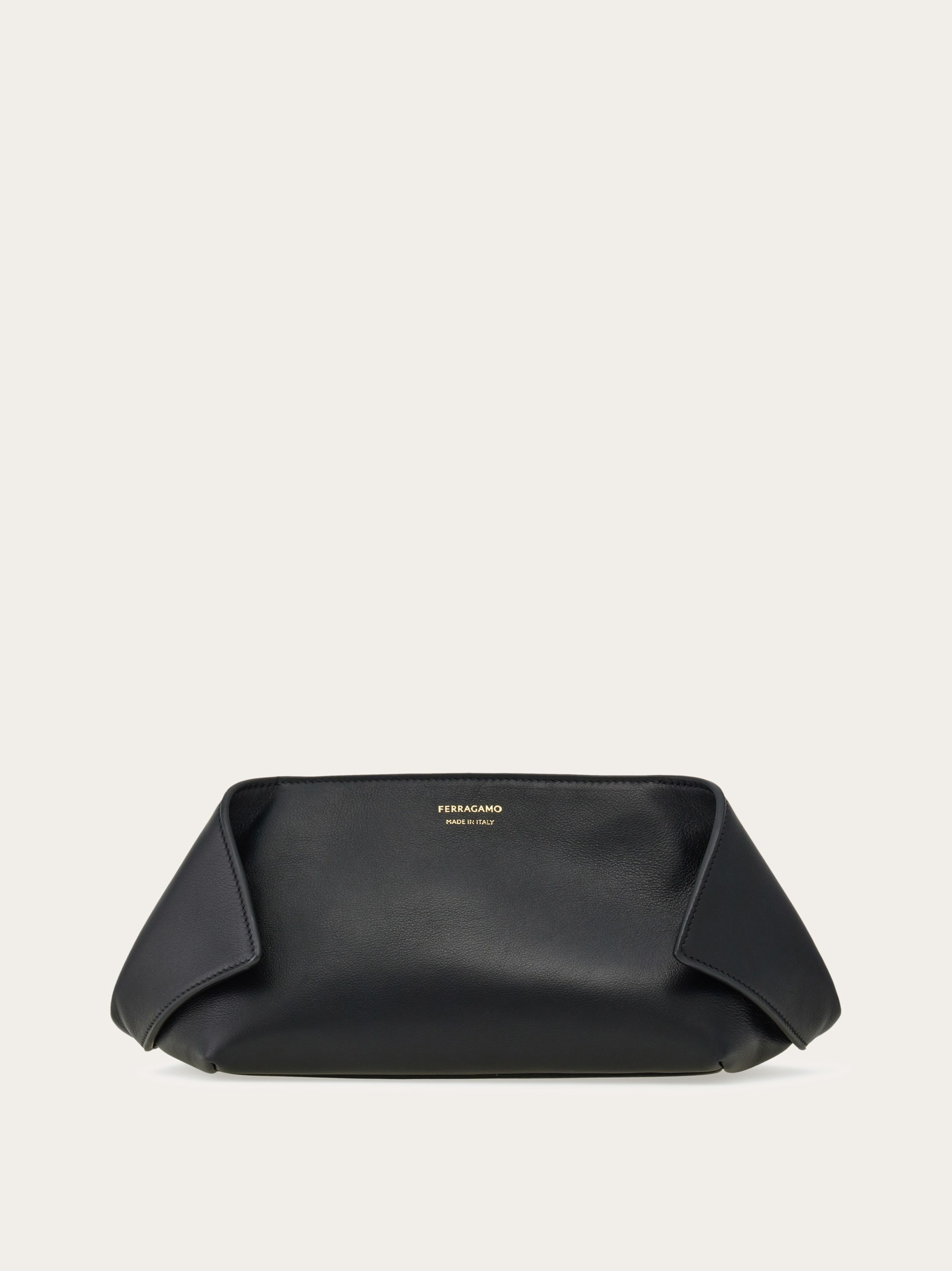 Creativity and an avant-garde touch define this new pouch in soft calfskin, with folded sides that resemble delicate fabric. Minimalist in its lines, it features a double magnetic closure and a lined interior with a zip pocket. The padded, braided wristlet provides an alternative styling option. - height 5.1 IN length 11.8 IN width 6.6 IN - Composition: calfskin - 1 zipped pocket, 1 compartment - Made in ITALY - Product code: 220880 781257