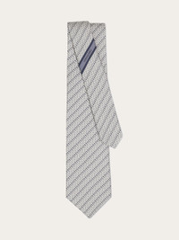 Pure silk tie featuring a pattern of interlocking Gancini laid over a regimental pattern in complementary shades. The layered look echoes the rich feel of this sophisticated accessory. - Composition: 100% silk - Made in ITALY - Product code: 351258 784213