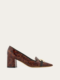 Presented in tortoiseshell patent leather, this pump draws inspiration from classic men's loafers with its squared toe and vamp. The block heel and padded leather insole ensure day-long comfort, while the iconic Gancini buckle adds a hint of glam. - Composition: patent calfskin - Made in ITALY - Product code: 01F929 784927
