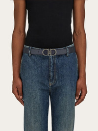The cool ruthenium toned buckle with a smooth finish and central signature gives this new Ferragamo belt an urban feel. Contrasting shades and textures on each side of the calfskin leather shaft open up several styling options. One side has a smooth, supple finish, while the other is naturally grainy. The adjustable length allows for a more personalized fit and style. We invite you to check our size guide for more information. - height 1.3 IN - Composition: calfskin - Made in ITALY - Product code: 679938 791937