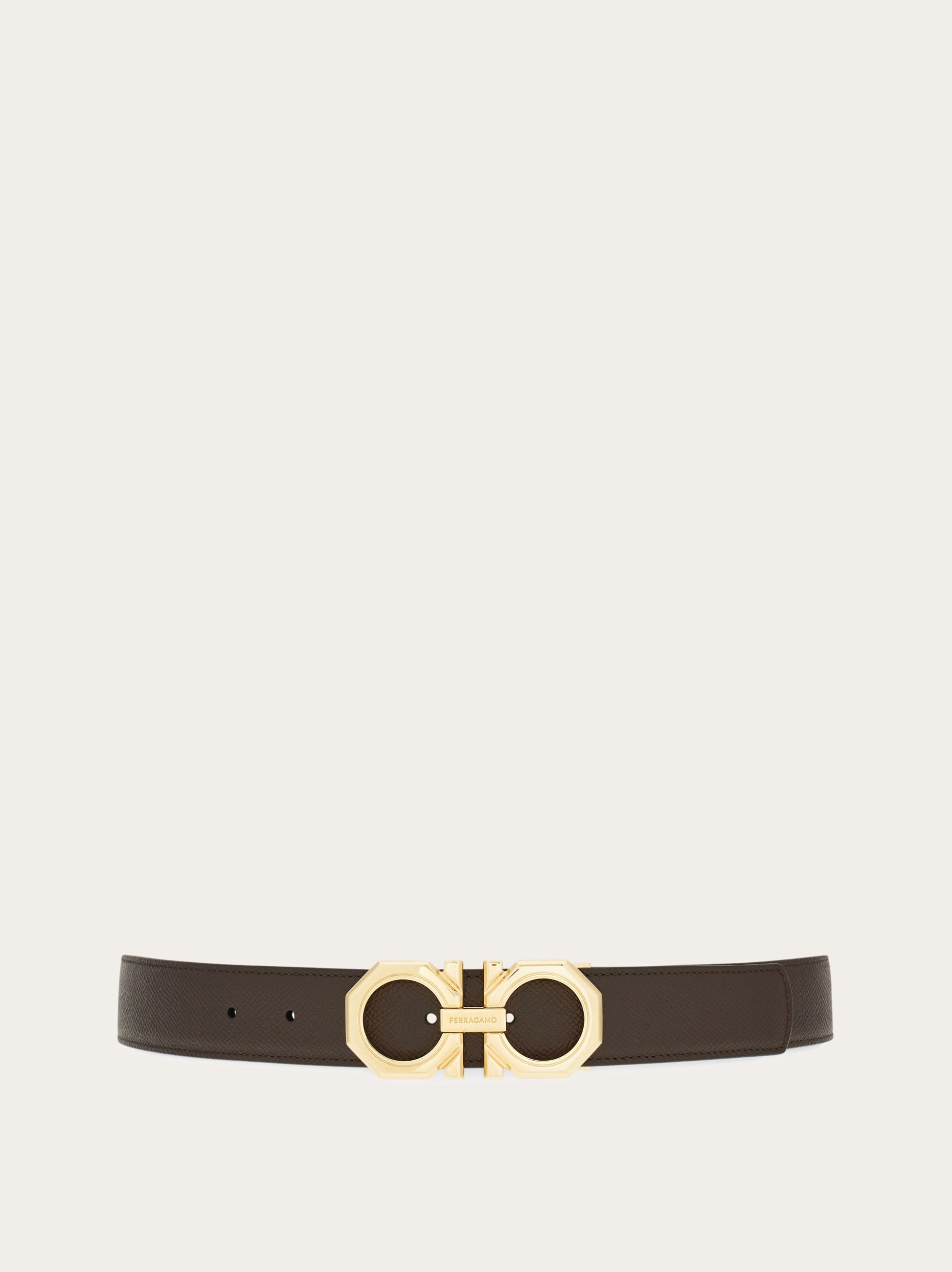 Reversible, adjustable Ferragamo belt featuring an octagonal shaped Gancini buckle and rectangular, golden buckle with central link with signature. The calfskin leather shaft is hammered, with a rich dappled texture in a different shade on each side. The length is adjustable. Please see the size guide for further details. - height 1.2 IN - Composition: hammered calfskin - Made in ITALY - Product code: 670266 780273