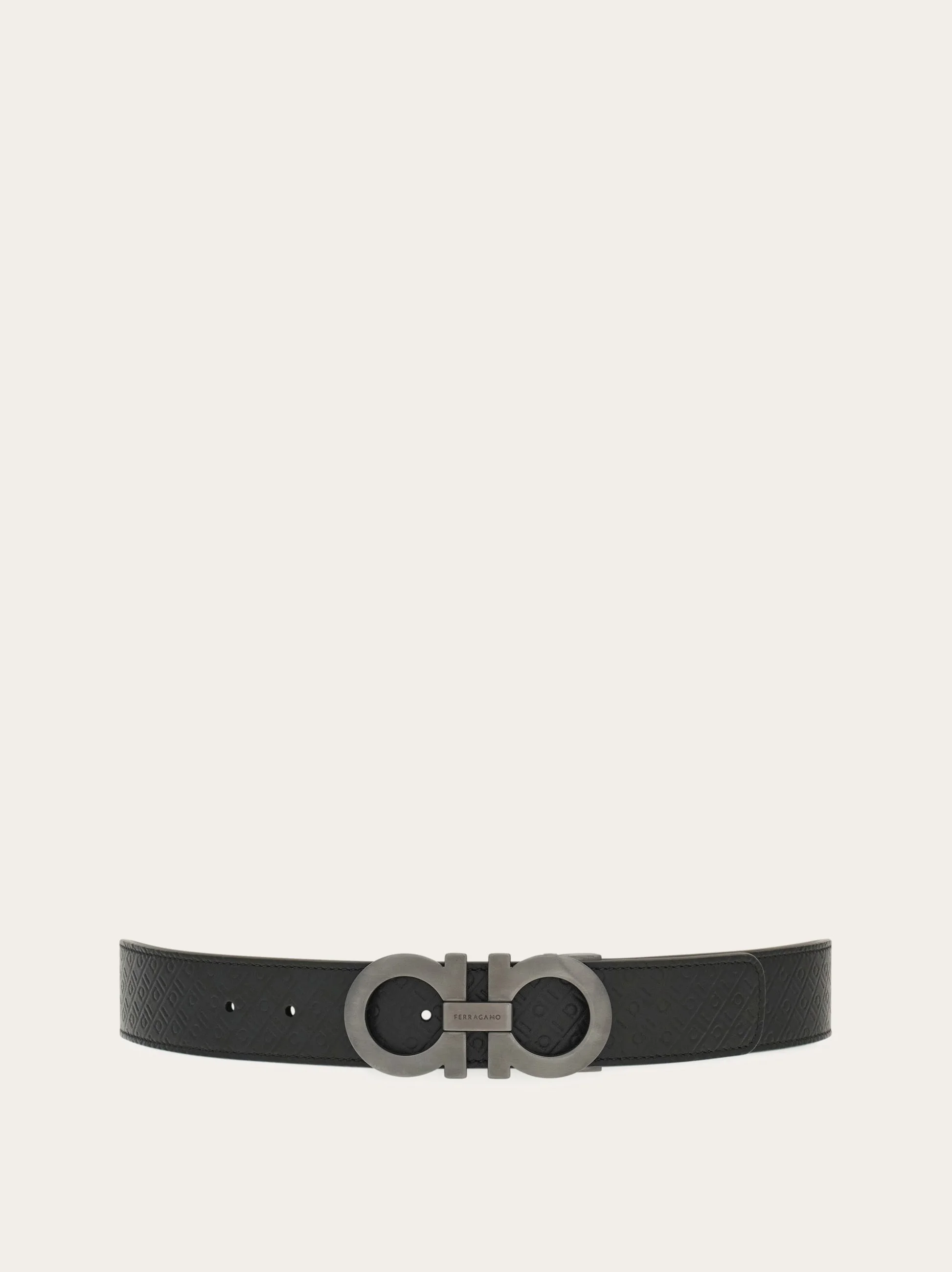 Elegant and luxurious, the central ruthenium buckle on this new Ferragamo belt gives it an urban appeal. The reversible calfskin shaft has a different texture on each side: one side is smooth, and the other is embossed with the Ferragamo monogram pattern. The length is adjustable. Please see the size guide for further details. - height 1.3 IN - Composition: smooth and embossed calfskin - Made in ITALY - Product code: 675542 780544